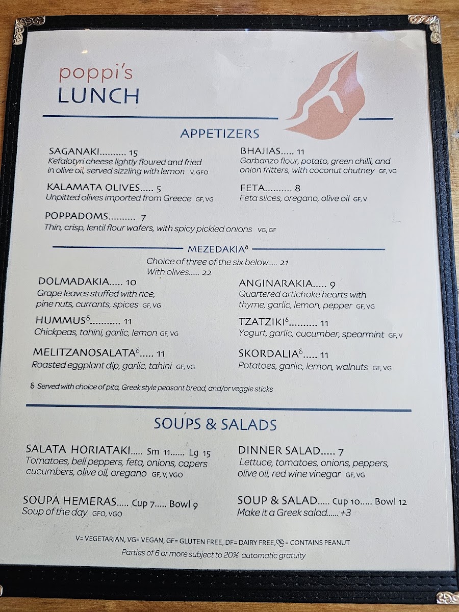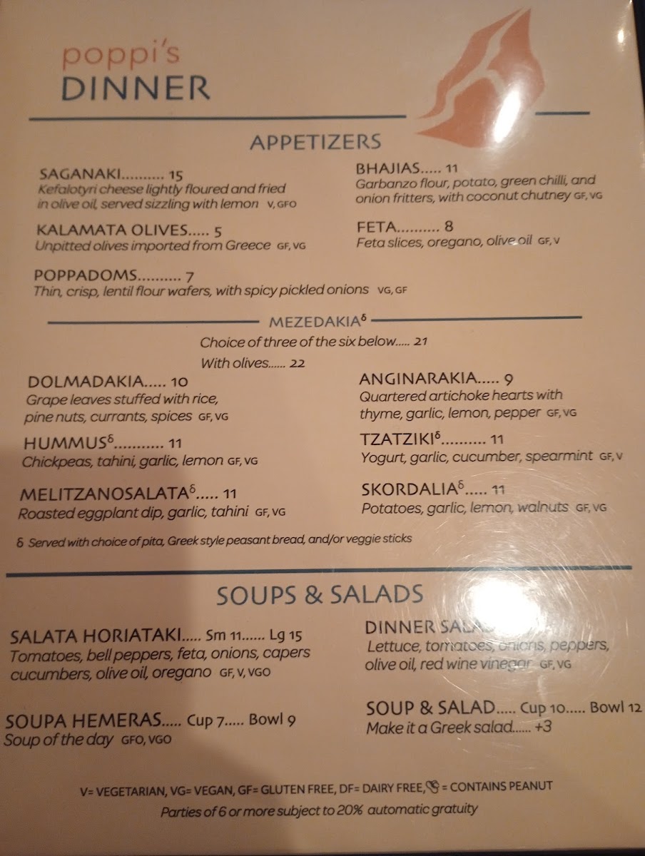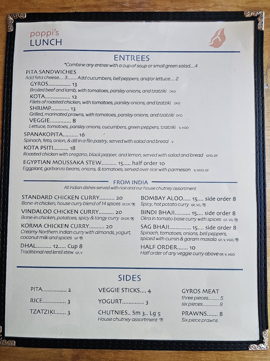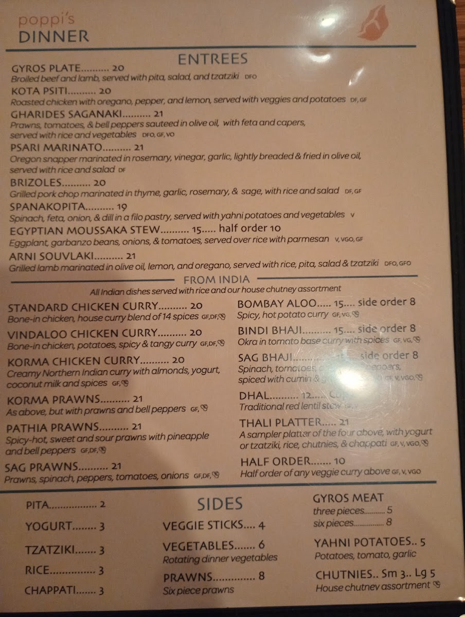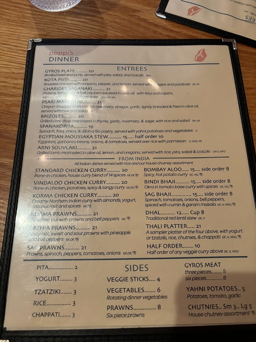The menu at Poppi's Anatolia features a diverse selection that combines Greek and Indian culinary traditions. It is structured to accommodate various dining preferences, offering a range of soups, salads, sides, main courses, desserts, and signature cocktails.